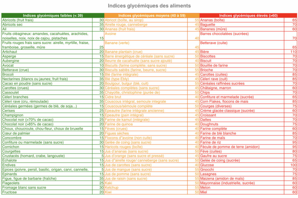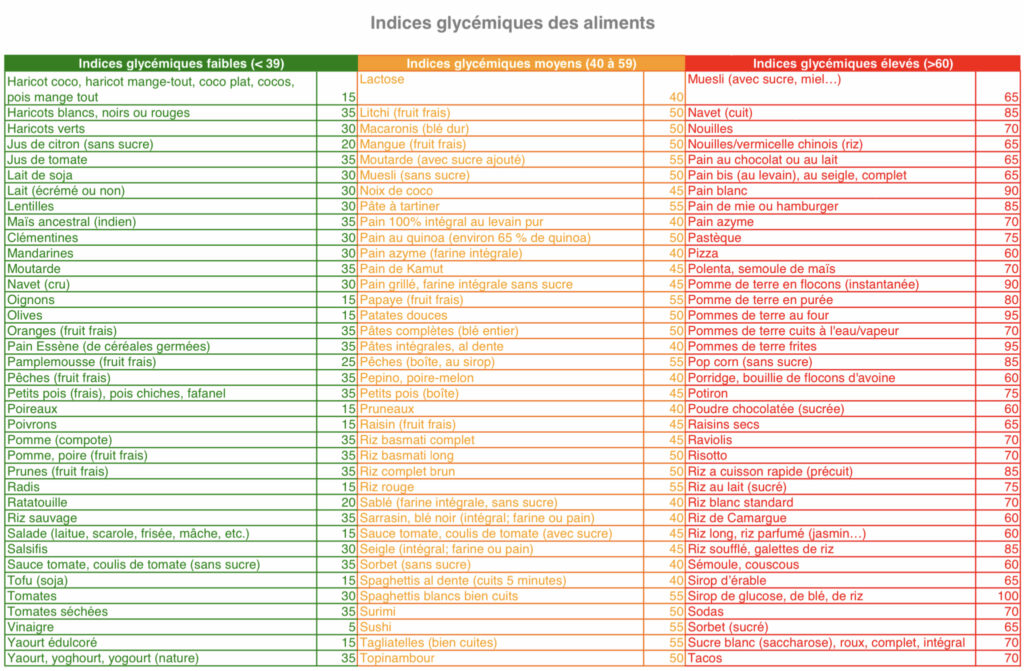 Comme câest Ă nây rien comprendre, je vous joins, ci-dessous, un tableau dâIG des aliments « courants ».