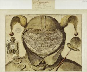 Ătrange estampe que celle du « Monde dans une tĂȘte de fou », Gourmont, 1590. Lorsque je mây suis penchĂ©e, jâai trouvĂ© cette illustration saisissante