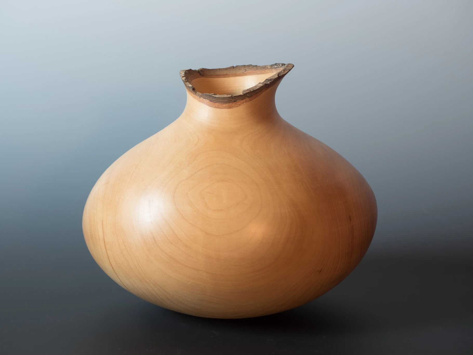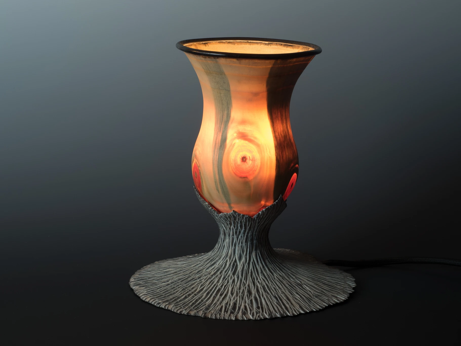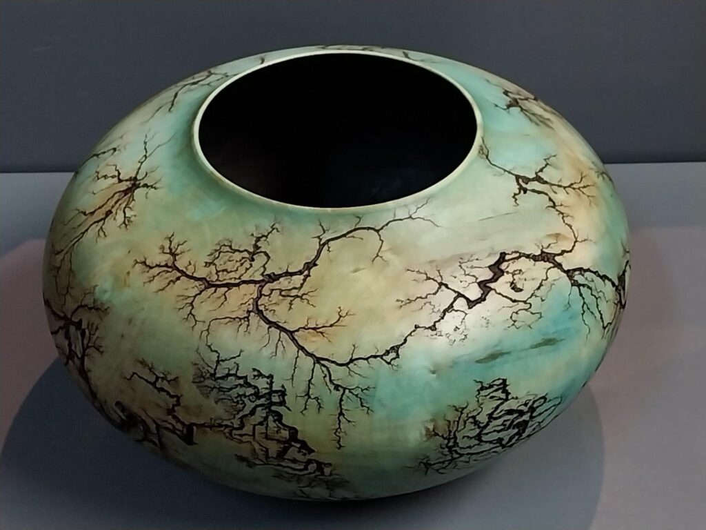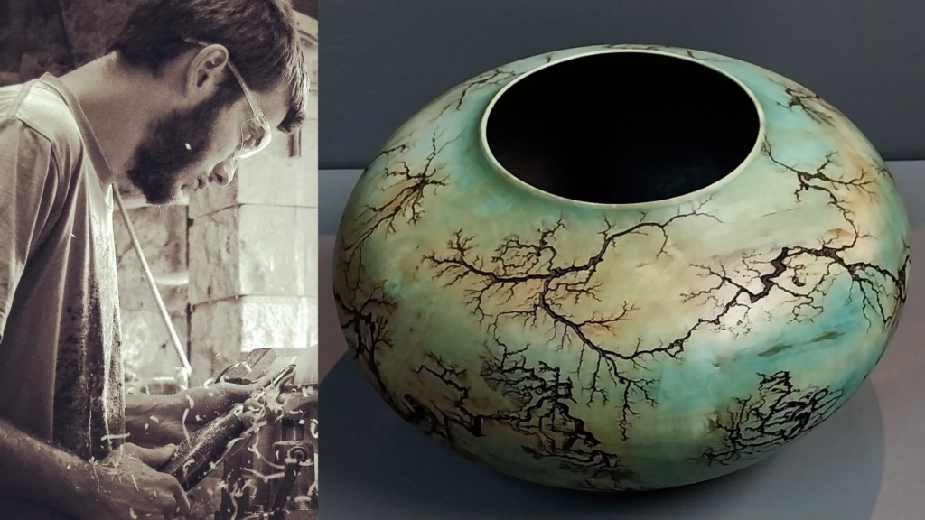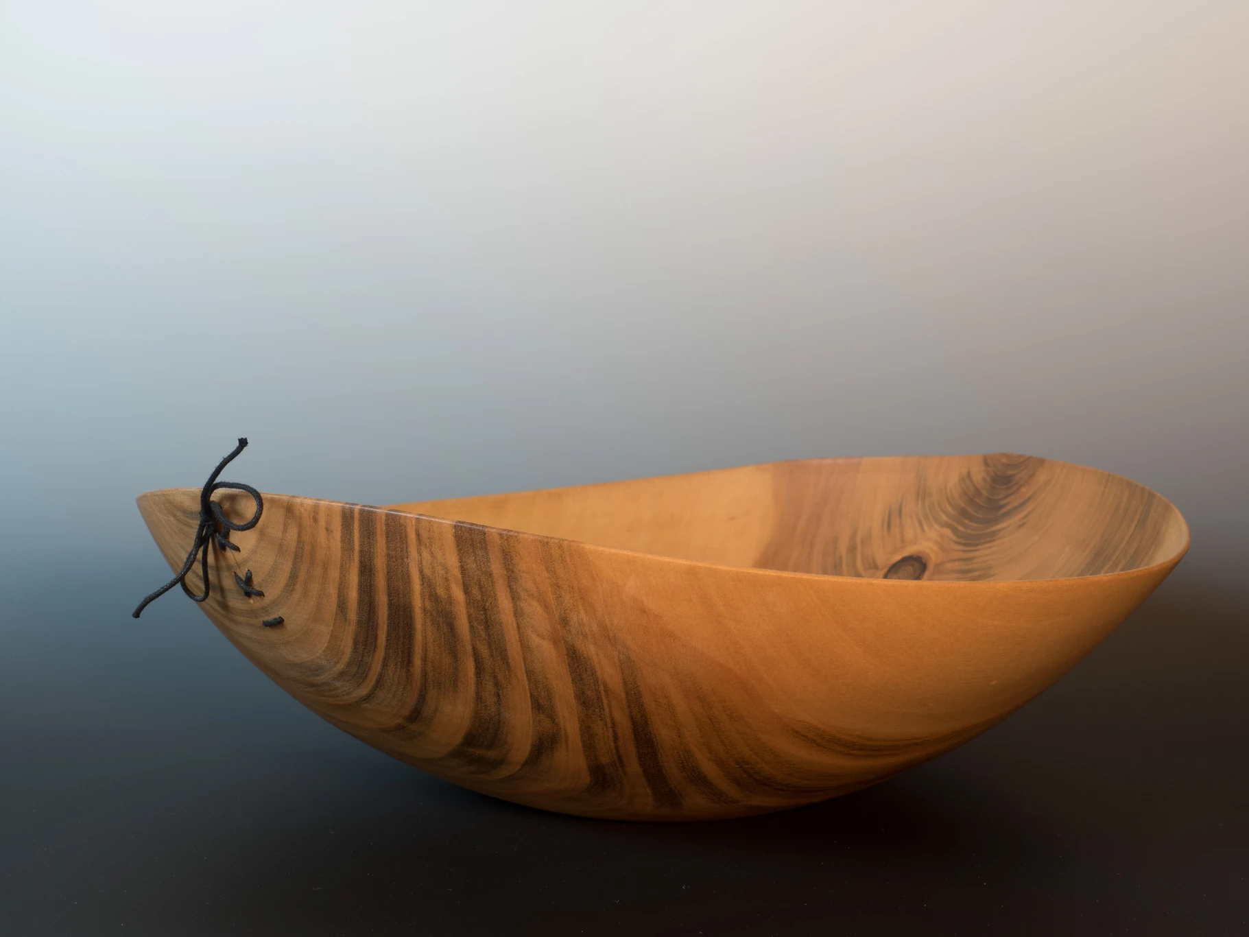 Tournée très fin sur un bois d’érable encore vert, la pièce joue sa partie au séchage où elle s’ovalise à son gré. Ses ornements, sous forme de fractales de Lichtenberg, sont gravés par un système à haut voltage qui dessine ces étranges motifs semblables à la foudre. Pour les magnifier, la pièce est teintée puis cirée avec une cire que Maleaume Hirsch réalise lui-même.