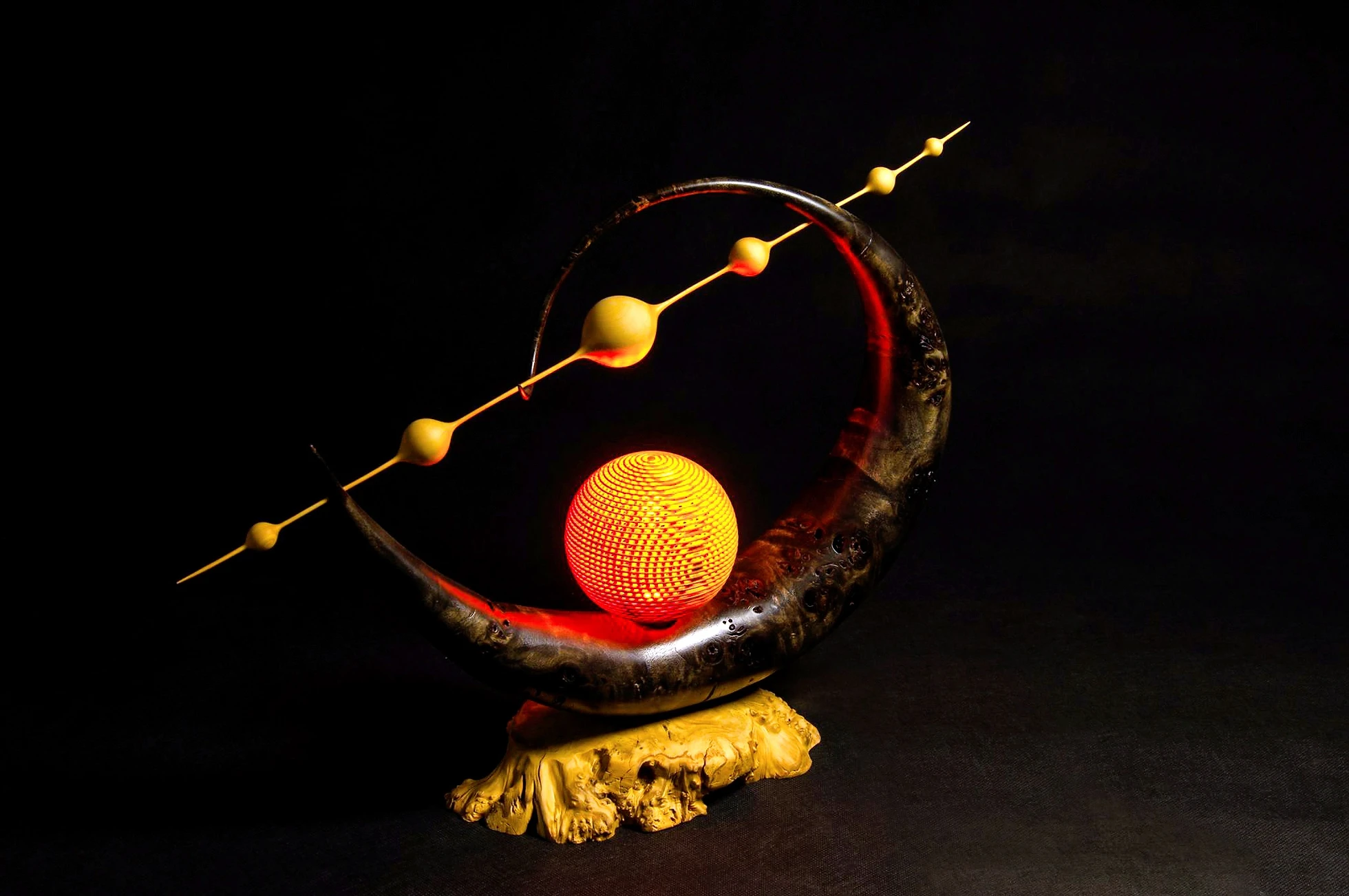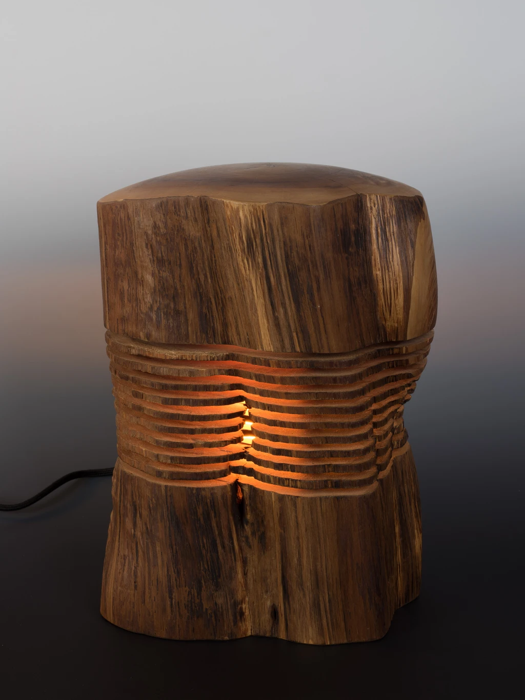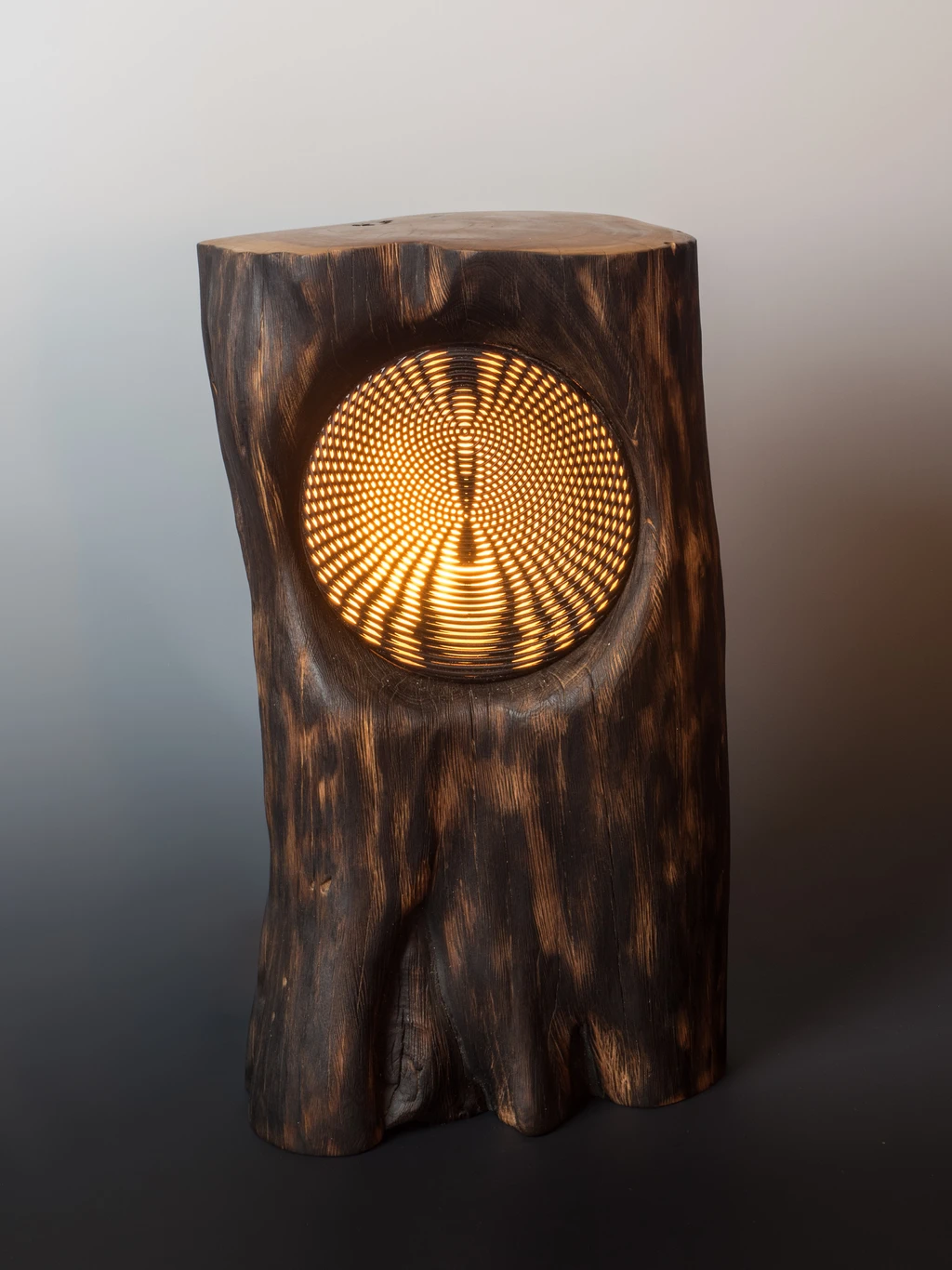 Tournée très fin sur un bois d’érable encore vert, la pièce joue sa partie au séchage où elle s’ovalise à son gré. Ses ornements, sous forme de fractales de Lichtenberg, sont gravés par un système à haut voltage qui dessine ces étranges motifs semblables à la foudre. Pour les magnifier, la pièce est teintée puis cirée avec une cire que Maleaume Hirsch réalise lui-même.