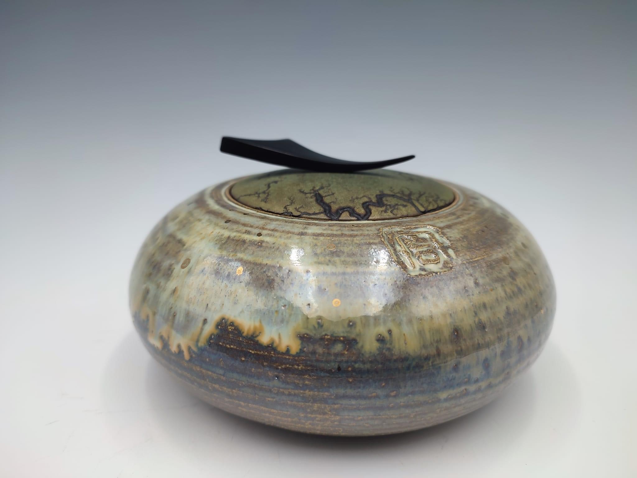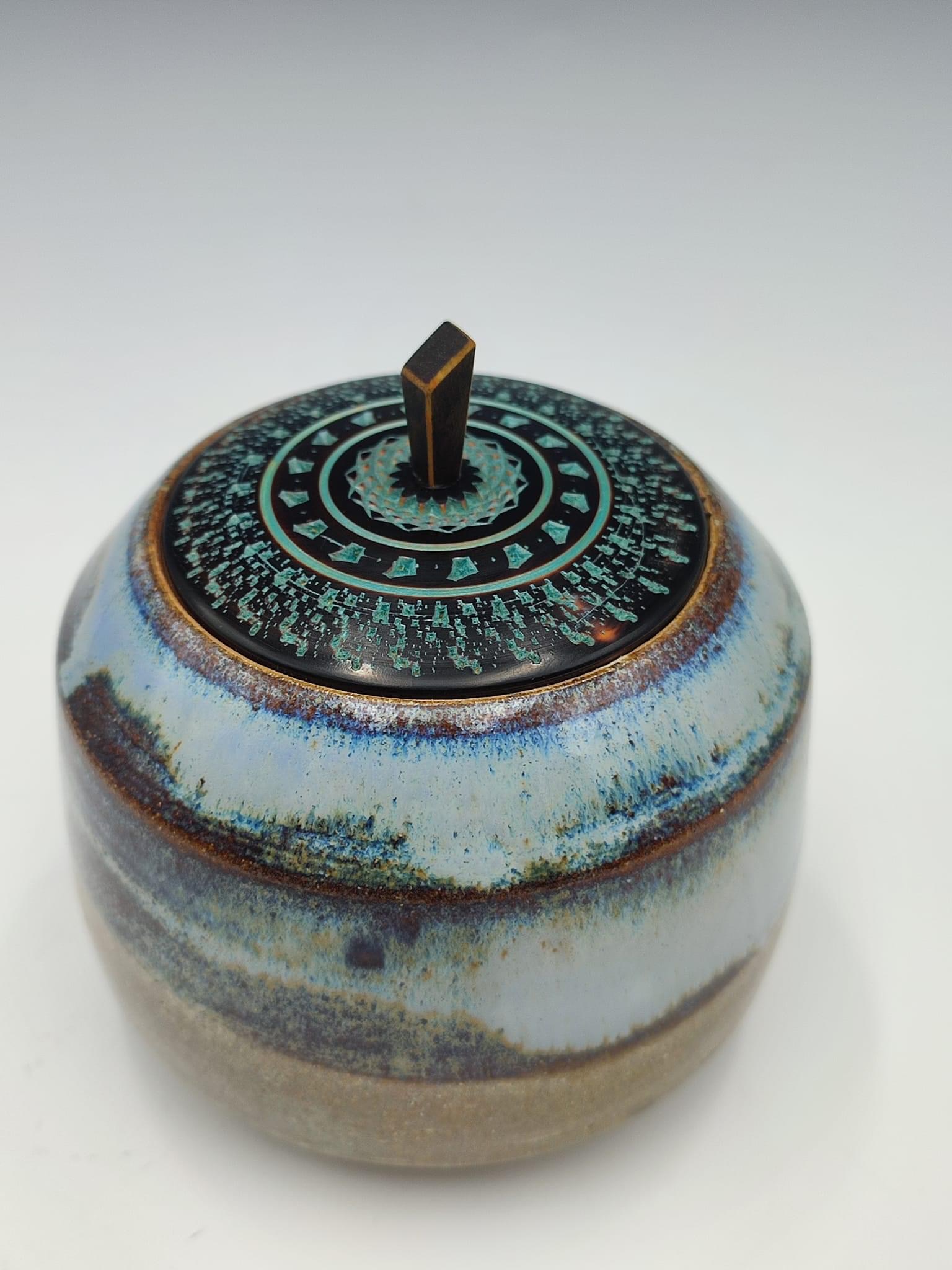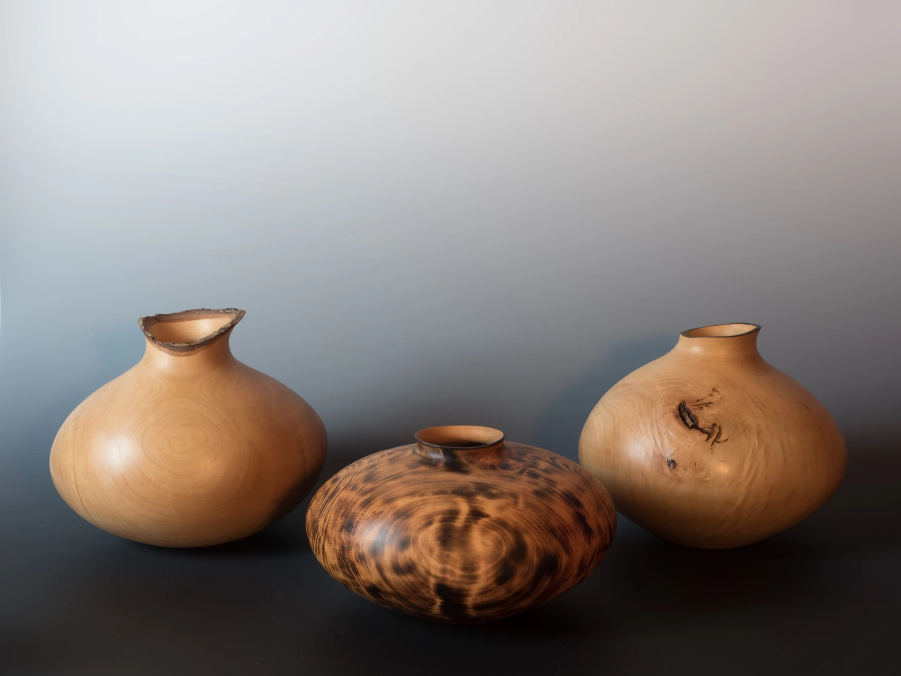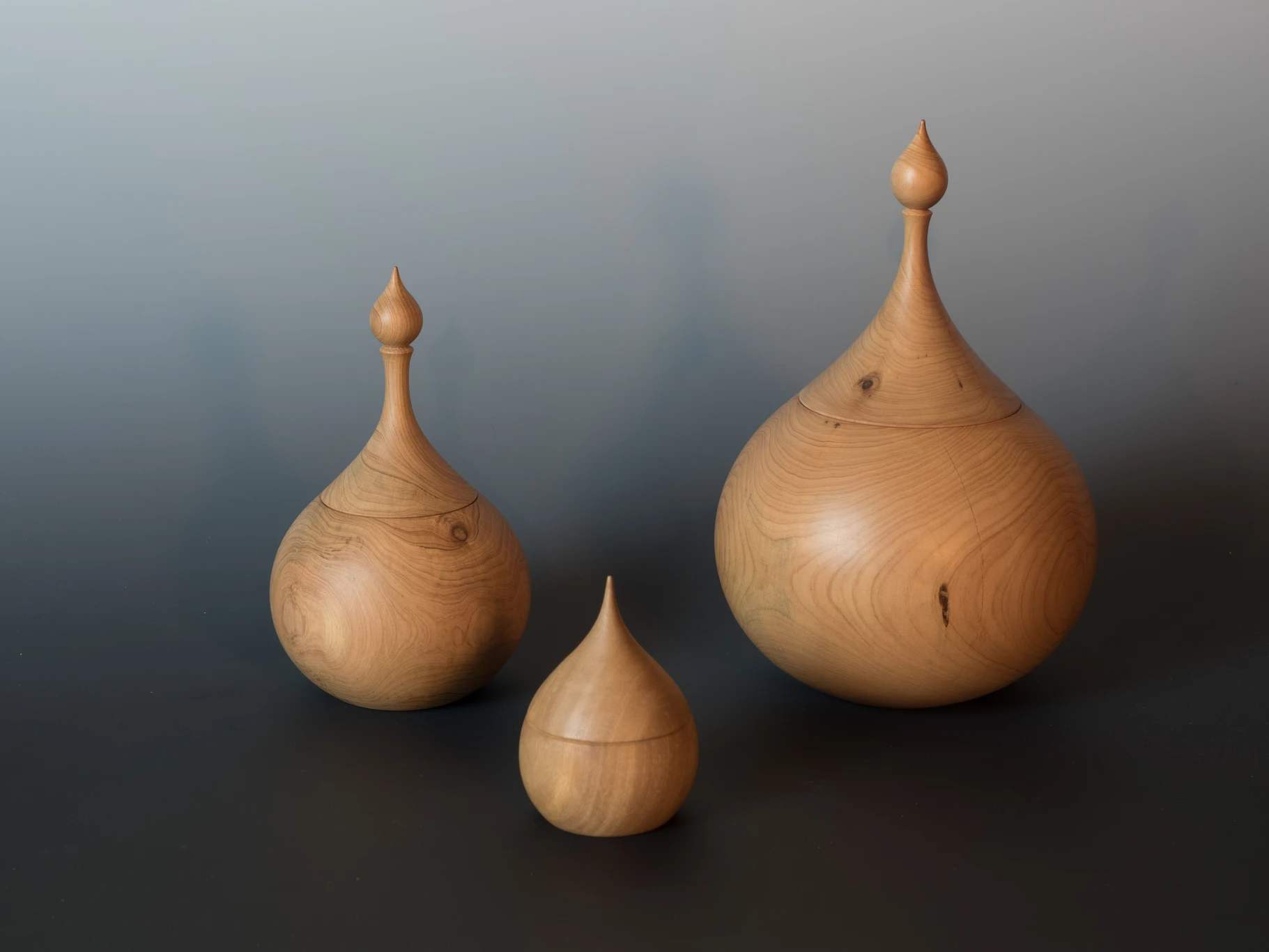 Tournée très fin sur un bois d’érable encore vert, la pièce joue sa partie au séchage où elle s’ovalise à son gré. Ses ornements, sous forme de fractales de Lichtenberg, sont gravés par un système à haut voltage qui dessine ces étranges motifs semblables à la foudre. Pour les magnifier, la pièce est teintée puis cirée avec une cire que Maleaume Hirsch réalise lui-même.
