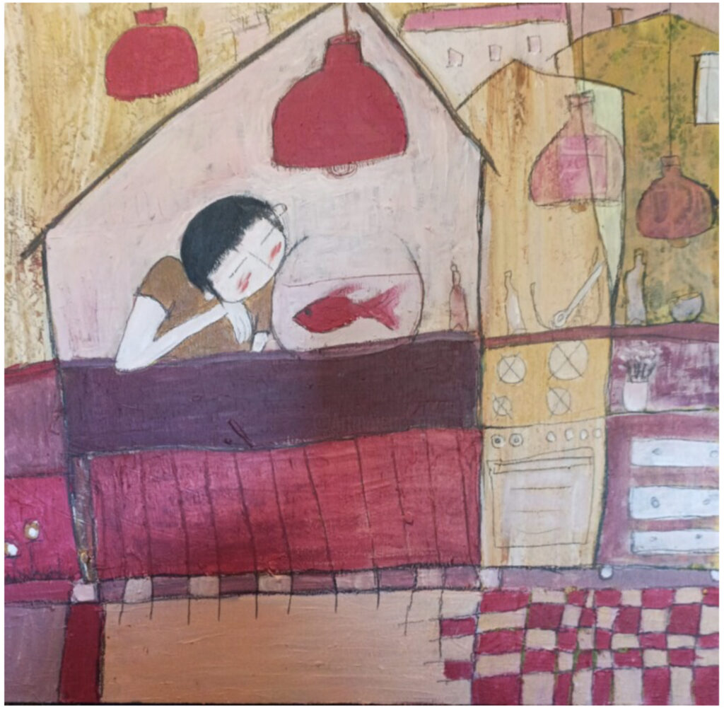 Telle que la psychanalyse écoute en même temps le manifeste et le latent, un garçon au poisson rouge reste en suspens entre ces deux dimensions. Dialogue-t-il avec cet autre si étrange ? S’interroge-t-il sur sa vie, leurs différences, leurs ressentis ? S’imagine-t-il à sa place ? Est-il hypnotisé par le chatoiement de ses couleurs, de son éclat ? Ou peut-être ne pense-t-il à rien ? n’observe-t-il que ses ronds dans l’eau ?
