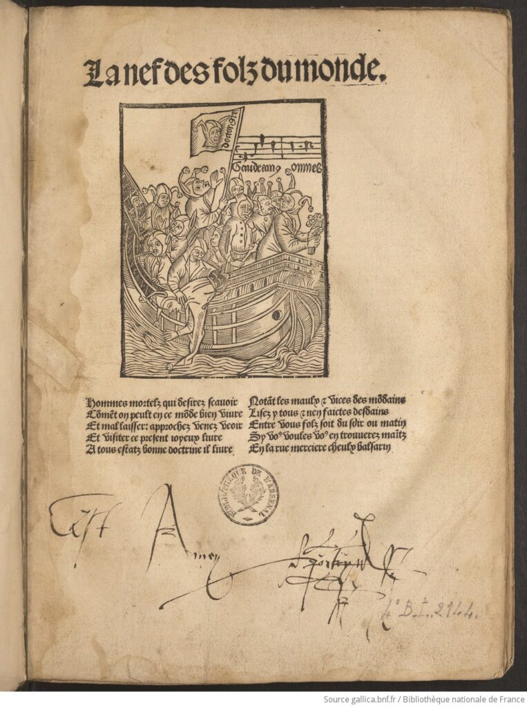 Sebastian Brant (1458-1521) s’en saisit pour publier en 1494 La Nef des Fous (La Nef des Fols de ce Monde). Ce long poème satirique critique ses contemporains en les enjoignant à reconnaître leurs parts de vice, de faiblesse et d’inconscience.